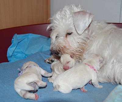 Ja sitten sieltä jo saavuttiinkin 22 2 2010 Laylalla oli vielä kaikki hyvin, mutta synnytyksen avausvaihe alkoi mielestäni jo lauantaina 20.2 ja jatkui tasaisesti koko ajan, mutta ilman suurempia polttoja. Eläinlääkärimme tutki laylan ja kohdunsuu oli mukavasti auki, mutta pentuja ei vielä tuntunut. tein päätöksen, että Layla leikataan toinen mahdollisuus olisi ollut vielä odottaa, kun päällisin puolin ei ollut mitään hätää. päätös oli oikea, koska kahden pennun sikiövesi (v.sin ja kelt) oli jo muuttunut aikas pahan näköiseksi, joten odotus olisi näille kahdelle voinut olla kohtalokasta. Pennut syntyivät n klo 17.00. |
