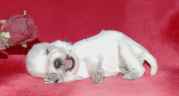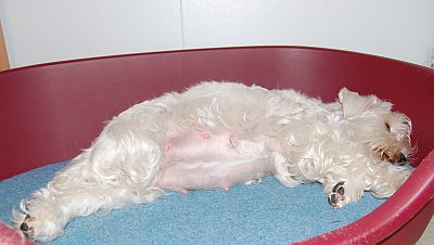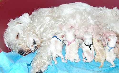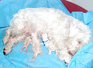 ![]() liisi pestynä ja puhtaana synnytyksen sotkuista, nyt kelpaa poseerata omien pentujen kanssa :) |